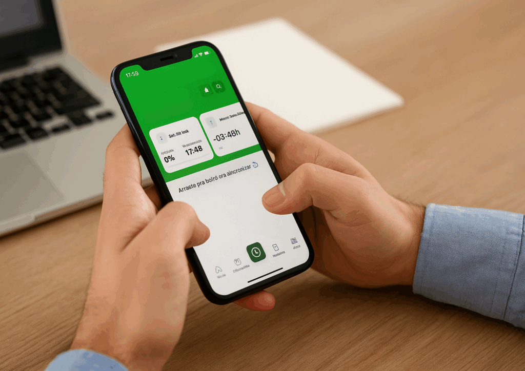 É um sistema que permite ao colaborador registrar sua jornada diretamente no smartphone (Android ou iOS) ou até via web.